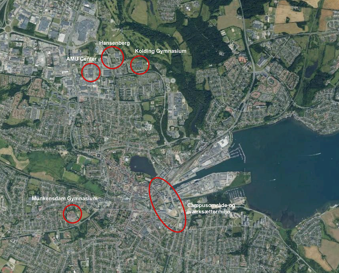 Uddannelsesinstitutioner, campusområder og innovations- og iværksættermiljøer i Kolding by. Det på kortet markerede campusområde m.m. rummer bl.a. uddannelsessteder, ungdomsboliger, Pakhuset på Inderhavnen samt House of Innovation i Jernbanegade.