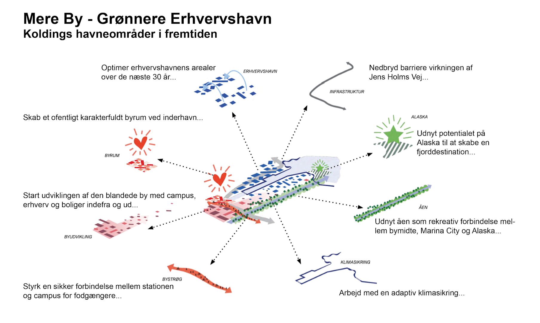 Visionsplanen er skabt med udgangspunkt i ejerstrategien for Koldings havneområder, som blev vedtaget i 2020 og med afsæt i Byrådets vision om, at erhvervshavn, by og fjord skal bindes sammen under overskriften ’Mere By og Grønnere Erhvervshavn’.