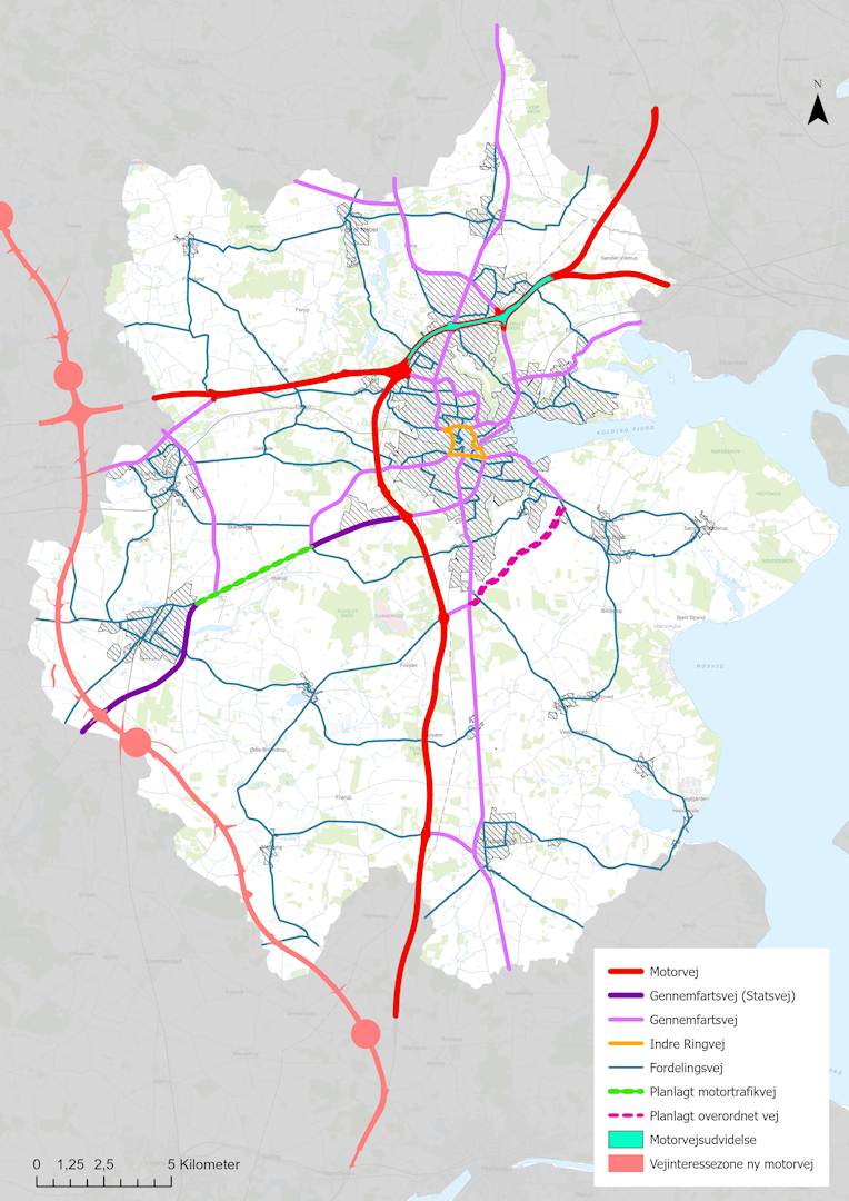 Vejhierarki for det samlede overordnede vejnet i Kolding Kommune samt nye vejforbindelser.