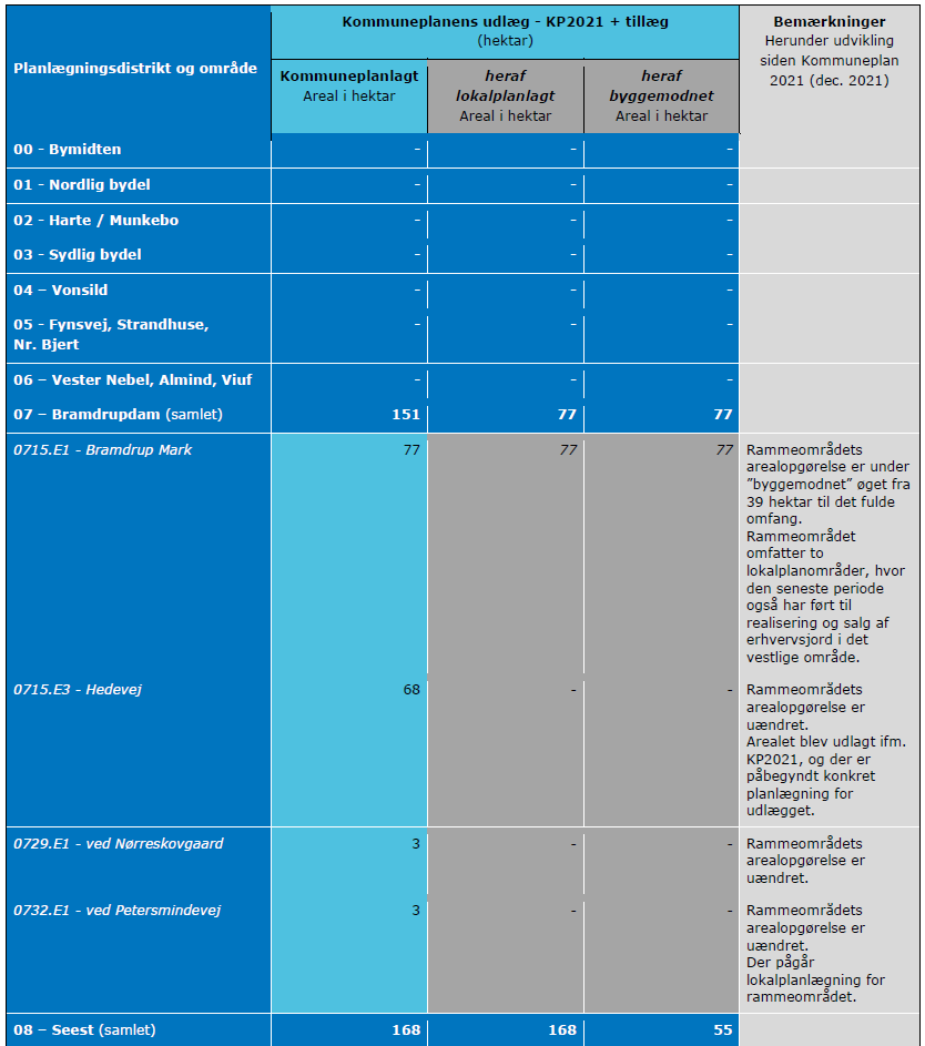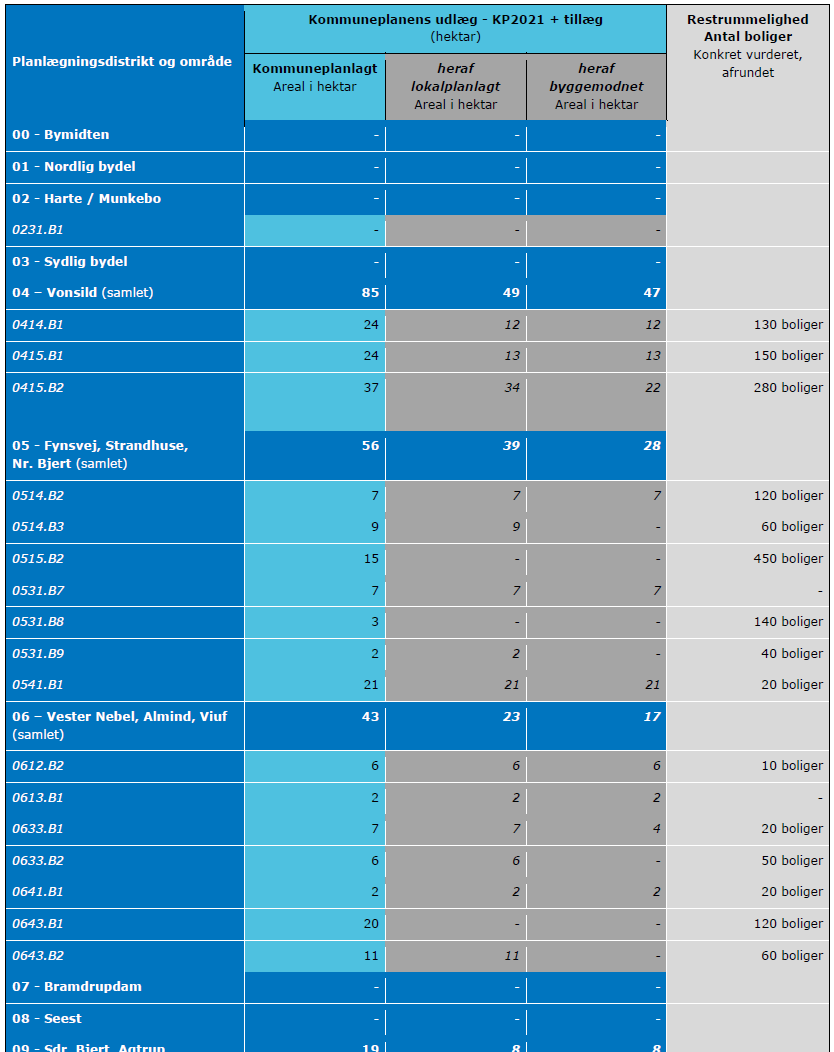 Jf. de statslige krav skal kommuneplanen indeholde en opgørelse af kommuneplanens udlæg, fordelt på henholdsvis kommuneplanlagte, de deraf lokalplanlagte samt byggemodnede arealer. Nedenstående skema viser en opdateret status ift. de rammeområder til boligformål, som endnu ikke er fuldt udnyttede. Skemaet omfatter rammeområder som fremgår af gældende kommuneplan – dvs. Kommuneplan 2021 og godkendte tillæg.