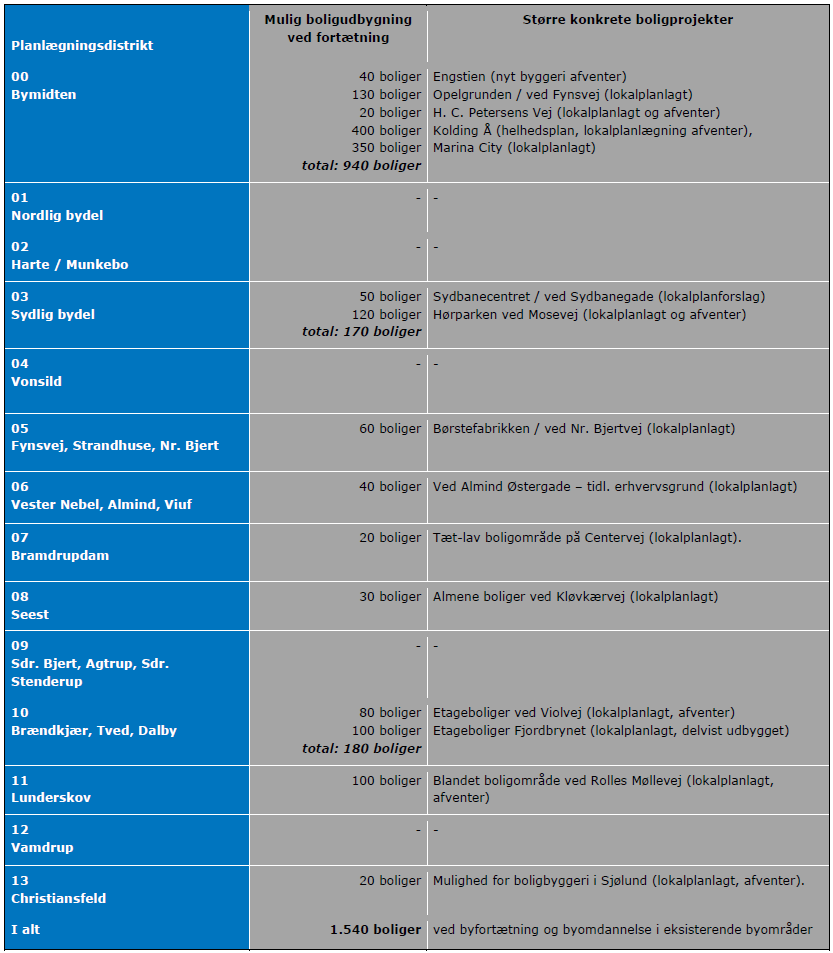 Opgørelsen viser at der potentielt er mulighed for, at der kan ske en boligudbygning ved fortætning på samlet godt 1.550 boliger. Heraf vil nogle af dem forventeligt realiseres over de næste tolv år, mens andre måske ikke bliver realiseret. Mange af projekterne er resultat af Kolding Kommunes fokus på at fortætte i eksisterende byområder, for dels at reducere omfanget af arealer der inddrages til udbygning på bar mark, og dels for at understøtte og skabe bymæssige kvaliteter.