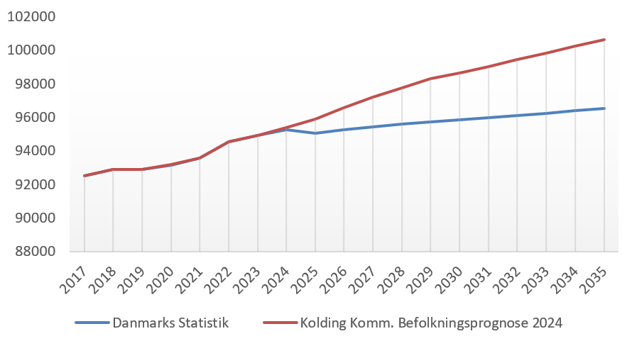 Befolkningsudvikling og -prognose 2017-2036 for Kolding kommune. Den blå kurve er baseret på Danmarks Statistiks fremskrivning af udvikling i indbyggertallet i Kolding kommune over de næste 12 år (opgjort i september 2024). Illustrationen viser desuden at Danmarks Statistiks prognose er mindre optimistisk end kommunens befolkningsprognose 2024 - vist med rød kurve.