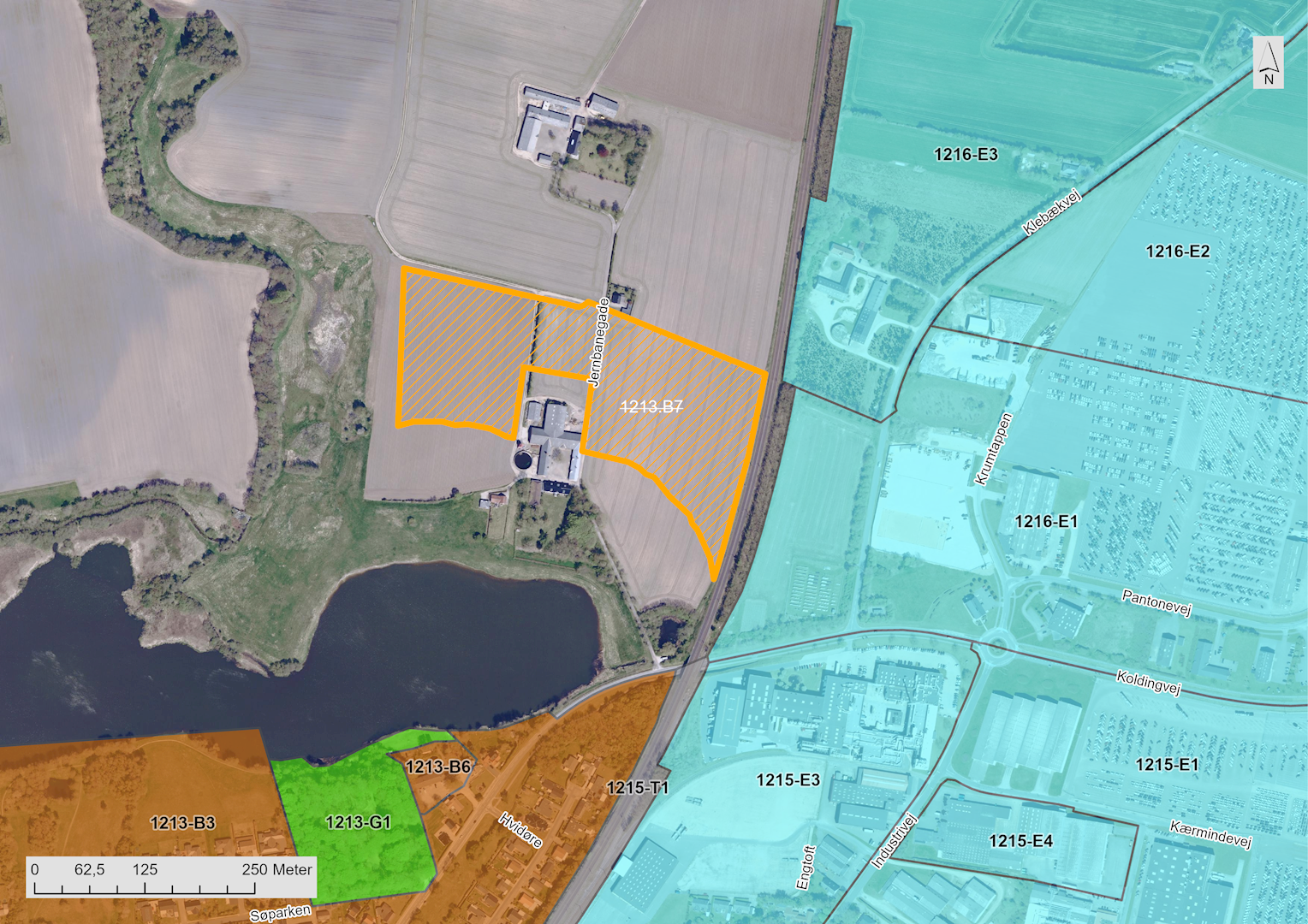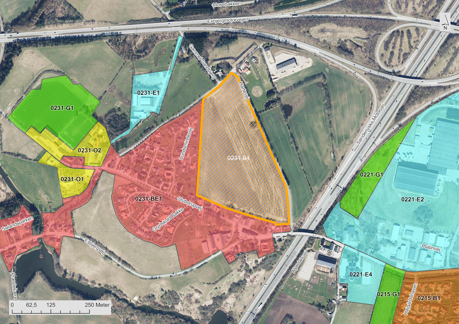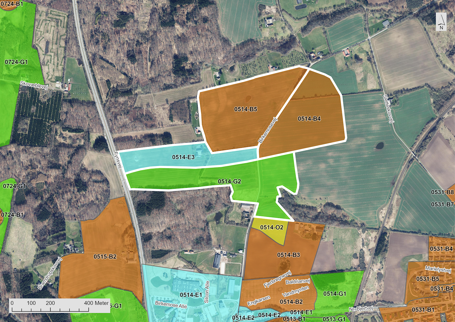 De udlagte arealer nordøst for Kolding, nord for Nr. Bjert Skov, er ikke omfattet af kommuneplanens landskabsudpegninger.