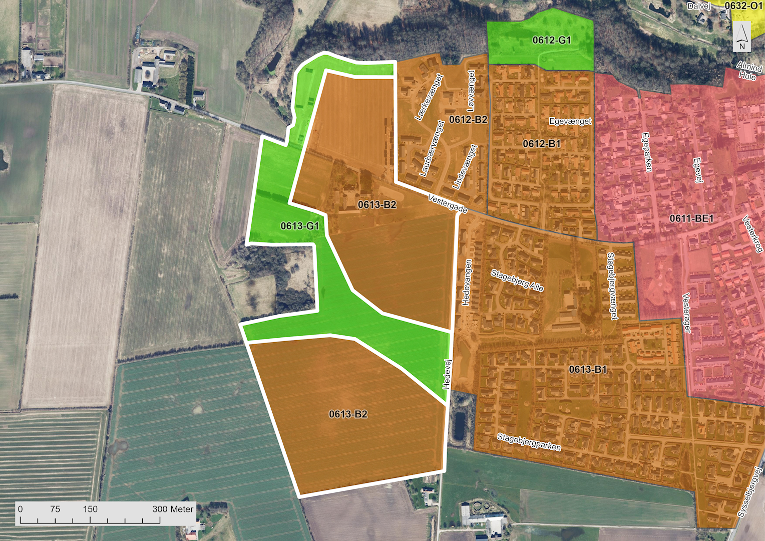 Sammen med udlæg til boligformål omkring Birkemosevej og grønt rammeområde mellem det lokalplanlagte boligområde ved Bøgehøjgård i øst til syd for erhvervsudlægget, vil der på sigt fremstå en ny samlet bydel på nord for Nr. Bjertvej, vest for jernbanen og omkring Fynsvej.