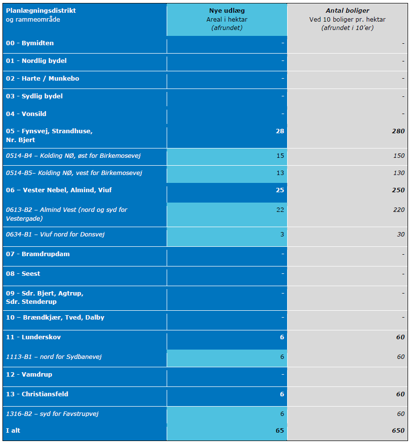 På baggrund af ovenstående overvejelser har Kolding Kommune besluttet sig for i Kommuneplan 2025 at udlægge de arealer, som fremgår af nedenstående opgørelse over nye udlæg til boligformål: