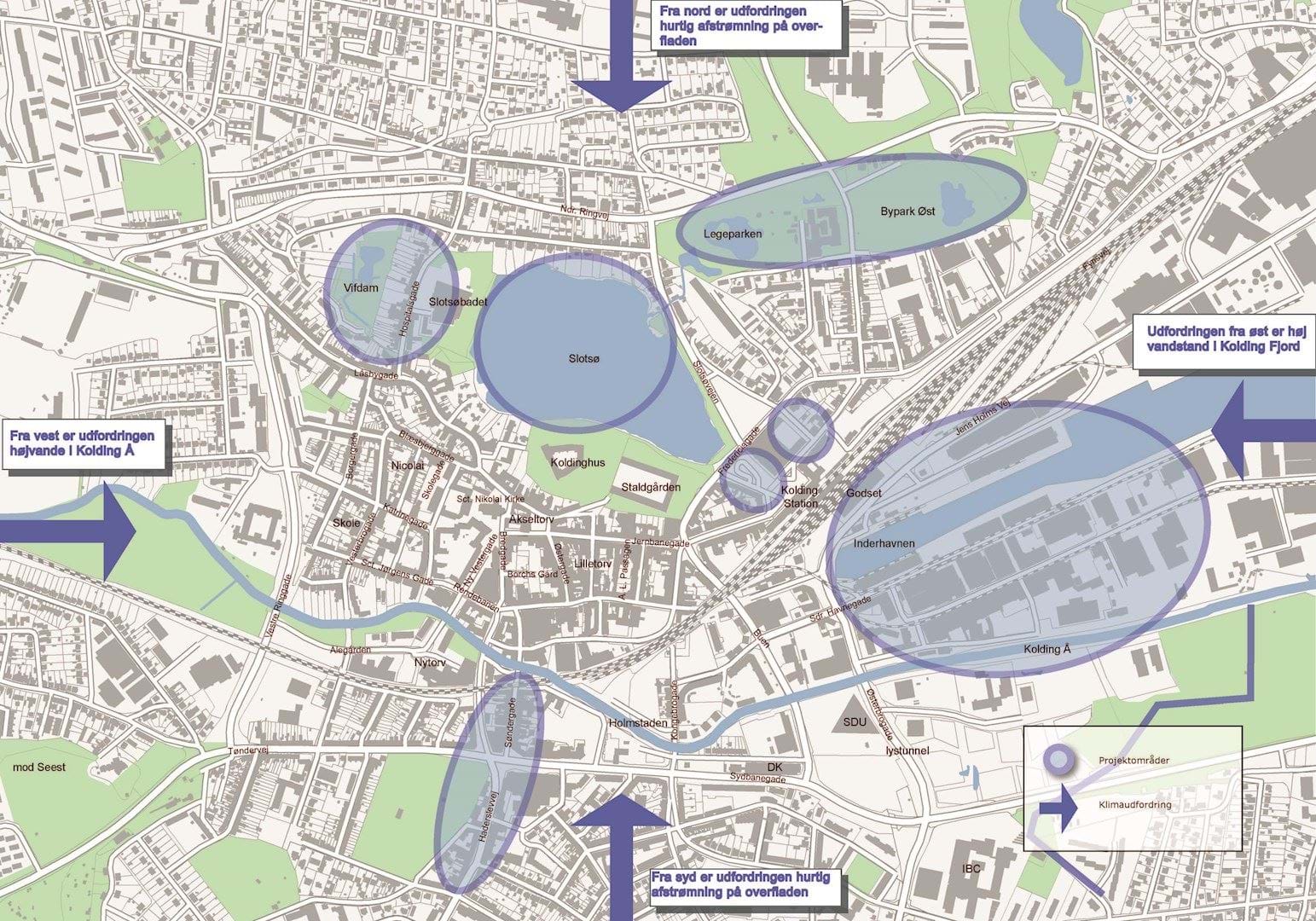 Med den naturskønne placering ved å og fjord samt med bakker i nord og syd der skråner ned mod bymidten, har Kolding by en placering i landskabet, der betyder at byen har stor risiko for oversvømmelser ved ekstrem regn og ved stormflod. Når ekstrem regn er kombineret med høj vandstand i fjorden, giver det yderligere udfordringer. Vand fra fjorden, der stuves op i åen, møder samtidig store afstrømninger til Kolding å, hvilket forstærker oversvømmelserne. Oplandet omkring Kolding by har stor indflydelse på hvor meget vand, der ender i bymidten. Derfor er det vigtigt både at se på forebyggelse i og udenfor bymidten. En samlet kortlægning, vurdering og beskrivelse af oversvømmelsesrisici fremgår af klimatilpasningsplanen for Kolding Kommune (se faktaboks længere nede på siden her, hvorfra den kan downloades).