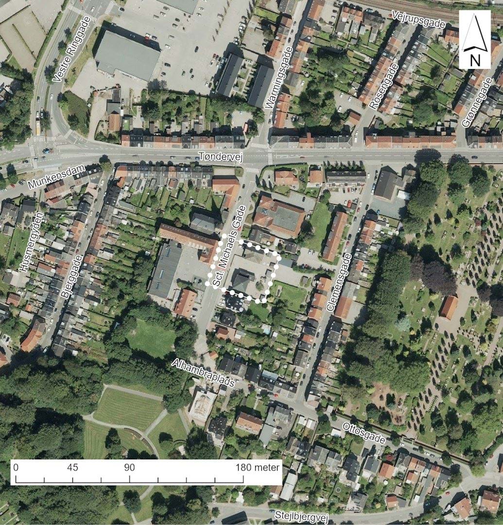 Luftfoto med afgrænsning af området omfattet af kommuneplantillægget.